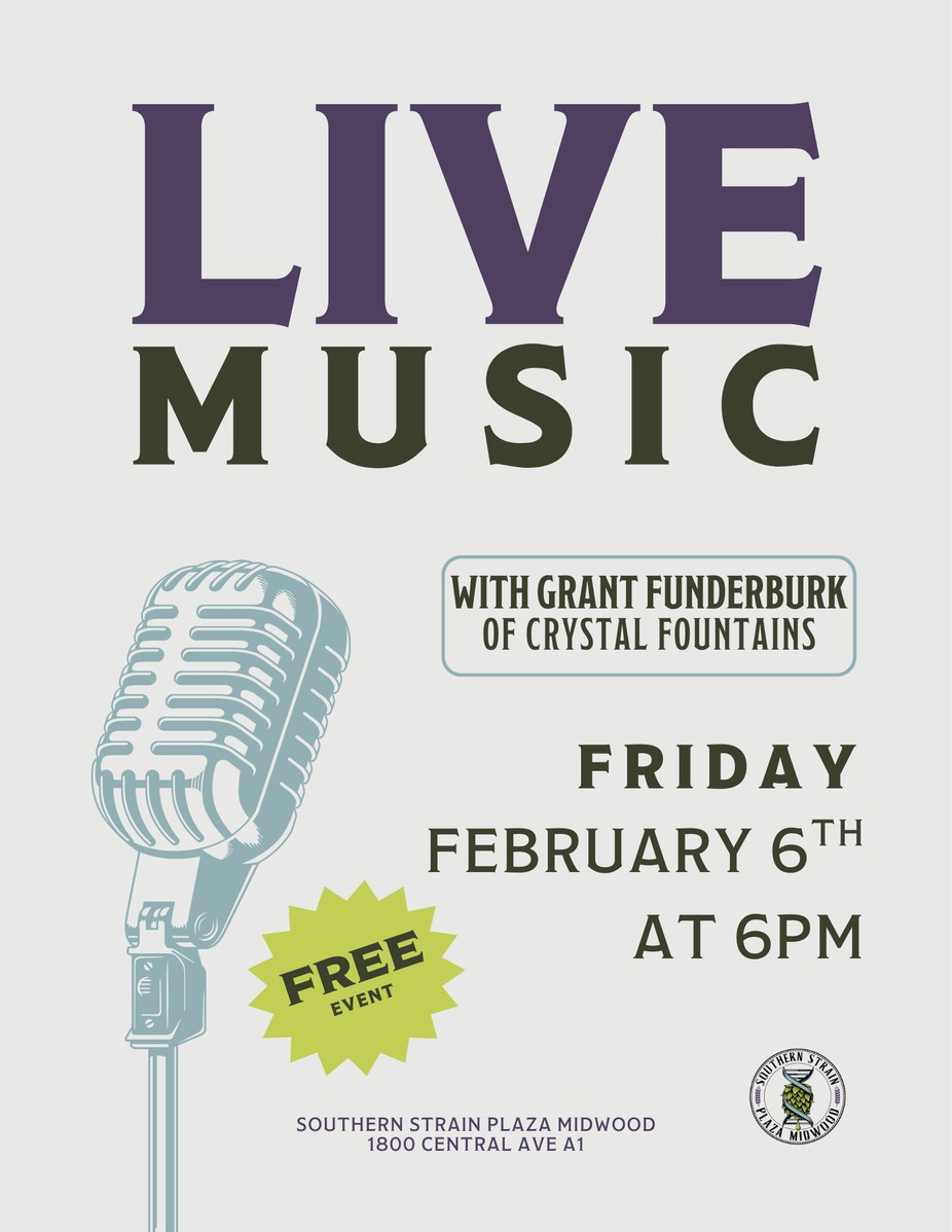 Join us on Friday, February 6th at 6pm for live music with Grant Funderburk from Crystal Fountains!